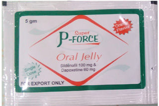 Please consult a doctor concerning the required dosage. Super P-Force Oral Jelly comes in 5 gm sachets containing 100 mg Sildenafil citrate and 60 mg of Dapoxetine Hydrochloride. The Super P-Force Oral Jelly solution melts very fast and is absorbed by the bodies enzymes in approximately 30 minutes after eating. If you suspect a Super P-Force Oral Jelly overdose, seek emergency medical help.